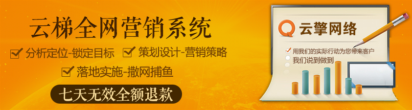 云梯系統為您七步爭奪行業網絡營銷霸主,而且公司承諾,網站上線7天無關鍵詞排名無條件退款,以我們多年的操盤經驗和技術實力為您排憂解難。公司推出包年9800元的包年套餐和3800元/月全新定制套餐(送勾魂營銷型網站)。